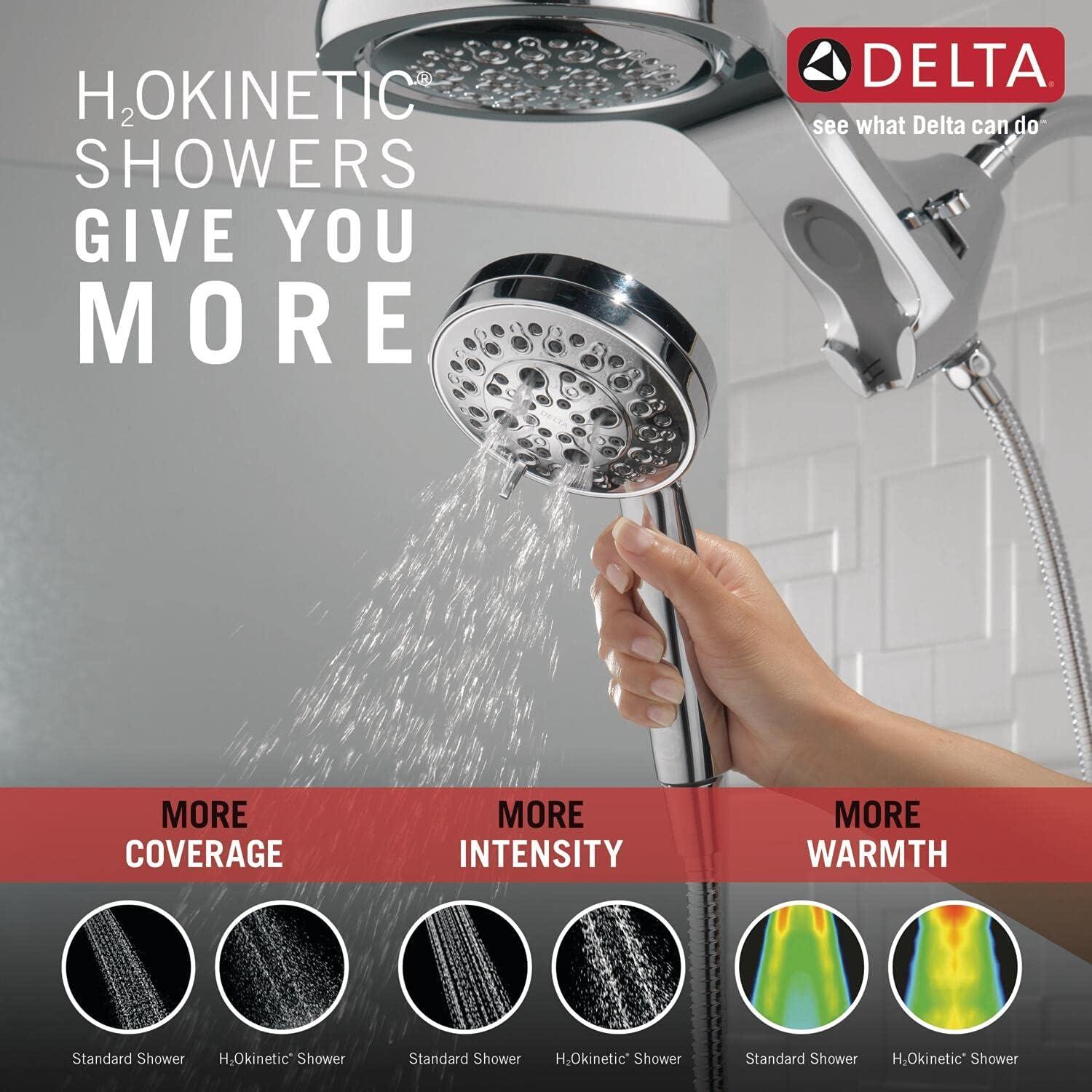 3X COVERAGE: Delta H2Okinetic Spray provides 3X more coverage than a standard shower head by creating a unique wave pattern and larger water droplets for more intensity and warmth