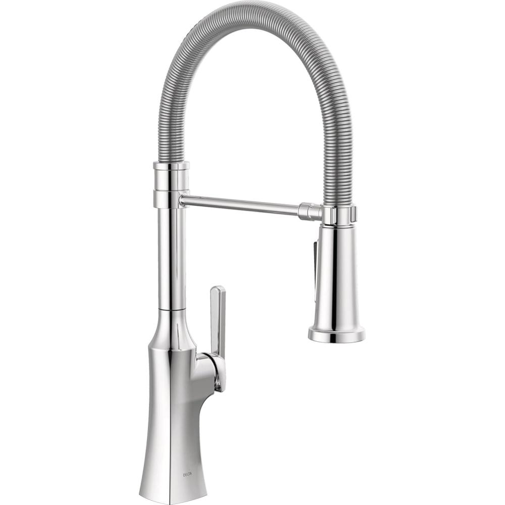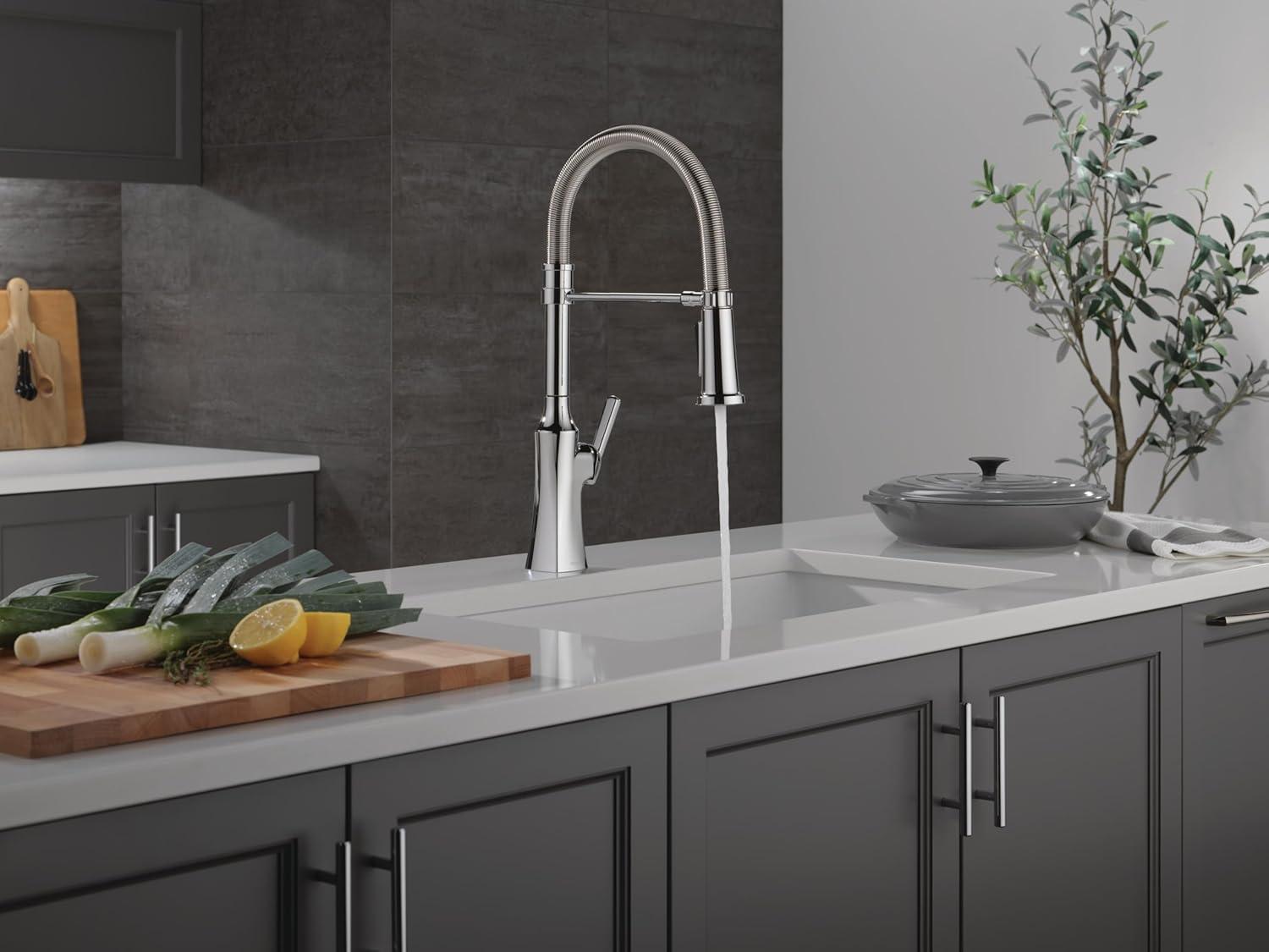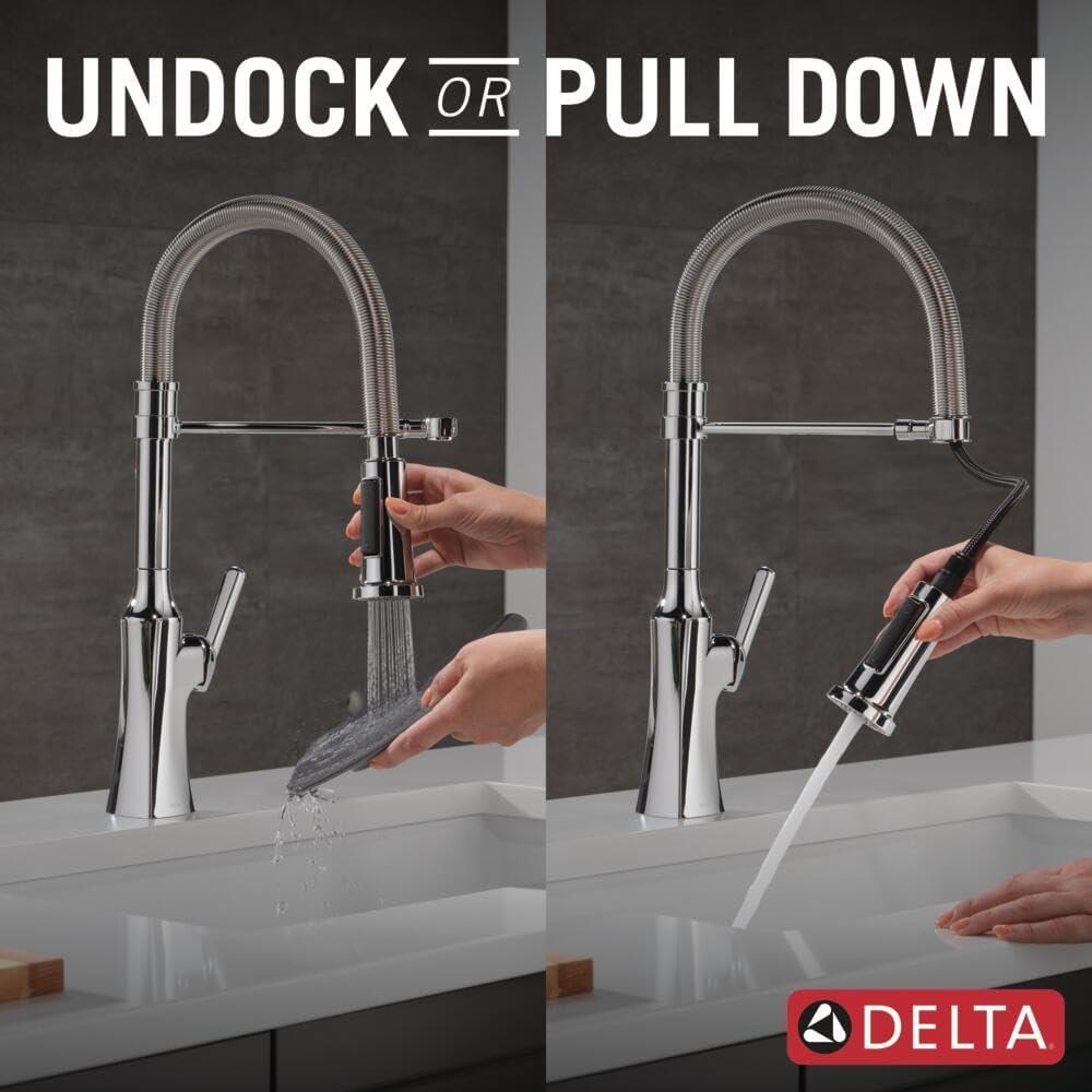 Make an impact in your kitchen with the Ermelo™ Pro Kitchen Faucet. Take control of your kitchen with the flexible, spring-design undocking spout, which can be easily disconnected then magnetically re-docked for free range of motion. When docked, the faucet still operates as a true pull-down faucet with MagnaTite® Docking. MagnaTite® Docking uses a powerful integrated magnet to set your pull down sprayer precisely into place and hold it there so it stays docked when not in use. Delta® kitchen faucets with Diamond Seal® Technology perform like new for life with a patented design which reduces leak points, is less hassle to install and lasts twice as long as the industry standard. Touch-Clean® Spray Holes allow you to easily wipe away calcium and lime buildup with the touch of a finger. You can install with confidence, knowing that Delta kitchen faucets are backed by our Lifetime Limited Warranty.