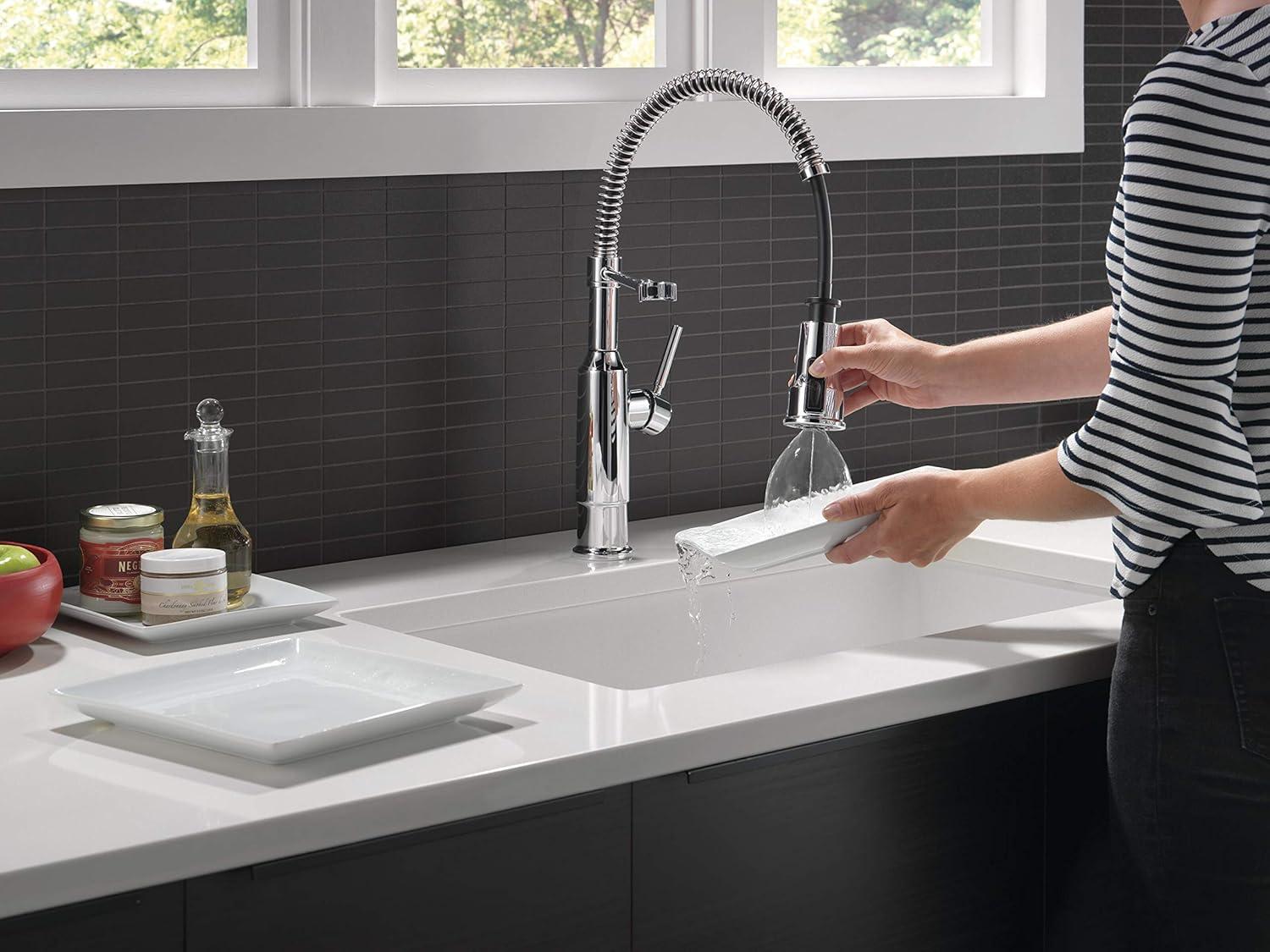 The Theodora™ Pro Kitchen Faucet brings a relaxed, classic look into your kitchen with new traditional elements. The spring pull-down provides ultimate flexibility, making it easy to turn, bend, stretch and reach more places. Delta® MagnaTite® Docking uses a powerful integrated magnet to set your pull down sprayer precisely into place and hold it there so it stays docked when not in use. ShieldSpray® Technology cleans with laser-like precision while containing mess and splatter. You can install with confidence, knowing that Delta kitchen faucets are backed by our Lifetime Limited Warranty