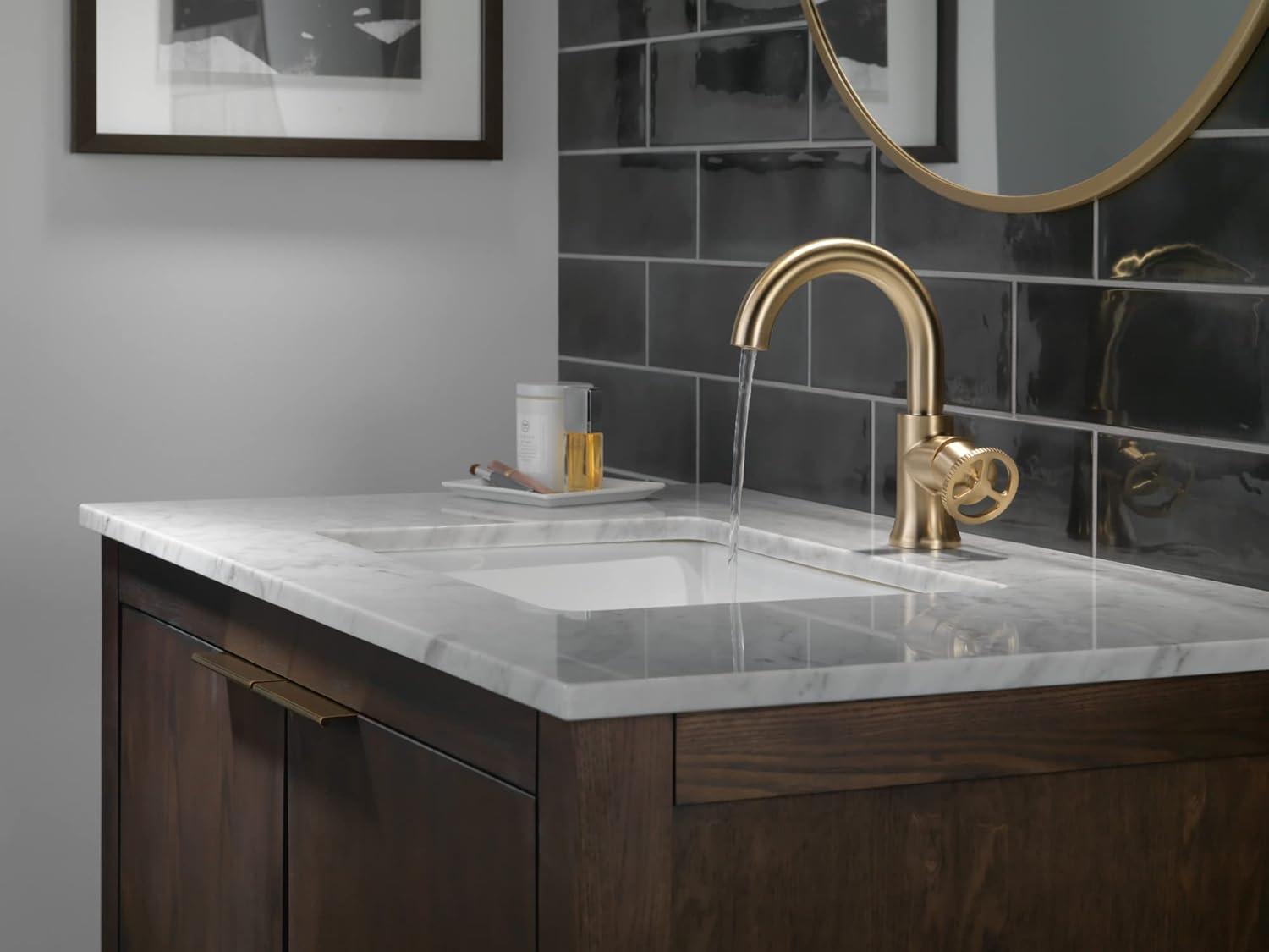 Inspired by the sleek elegance of modern European design, the Trinsic® Bath Collection with an industrial wheel handle completes the look of any contemporary bath. The pull-down spray wand features Delta® MagnaTite Docking which uses a powerful integrated magnet to pull your faucet spray wand precisely into place and hold it there so it stays docked when not in use. The Worry-Free Drain Catch is a simple solution to the common problem of pills, jewelry or other valuables washing down the drain. Delta® faucets with Diamond Seal® Technology perform like new for life with a patented design that reduces leak points, is less hassle to install and lasts twice as long as the industry standard. Delta WaterSense® labeled faucets use at least 20% less water than the industry standard — helping you save water without compromising performance. You can install with confidence, knowing that Delta faucets are backed by our Lifetime Limited Warranty.