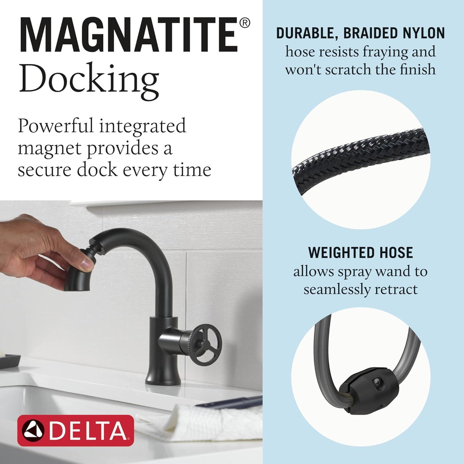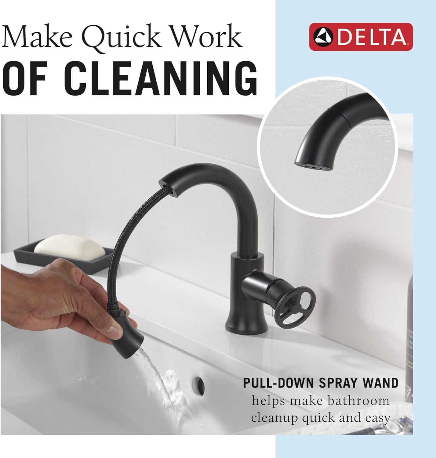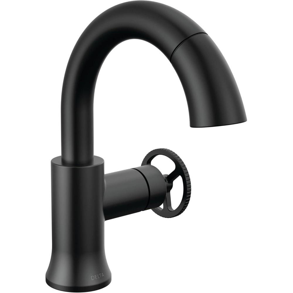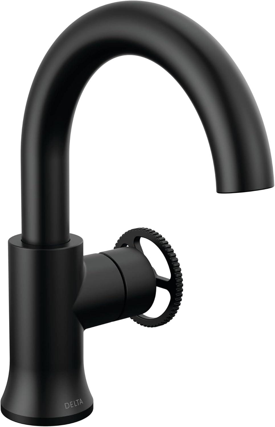 Delta Trinsic 1-Hole Pull-Down Bathroom Faucet with Wheel Handle, Polished Nickel High Arc Single Hole Bathroom Sink Faucet with Sprayer, Metal Push-Pop Drain Assembly, Polished Nickel 558HAR-PNPD-DST(Matte Black)