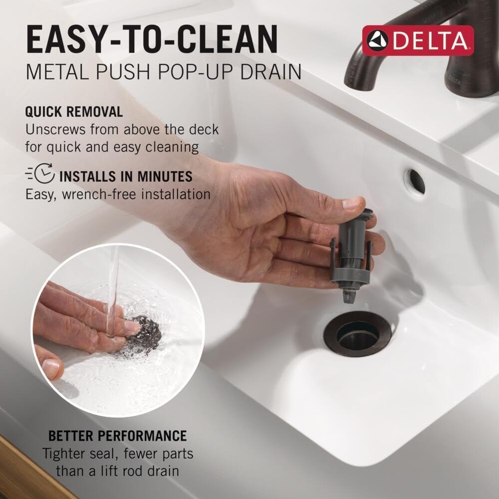EASY-TO-CLEAN DRAIN: Push pop-up drain unscrews from above the deck for quick removal and easy cleaning of hair and other bathroom sink debris